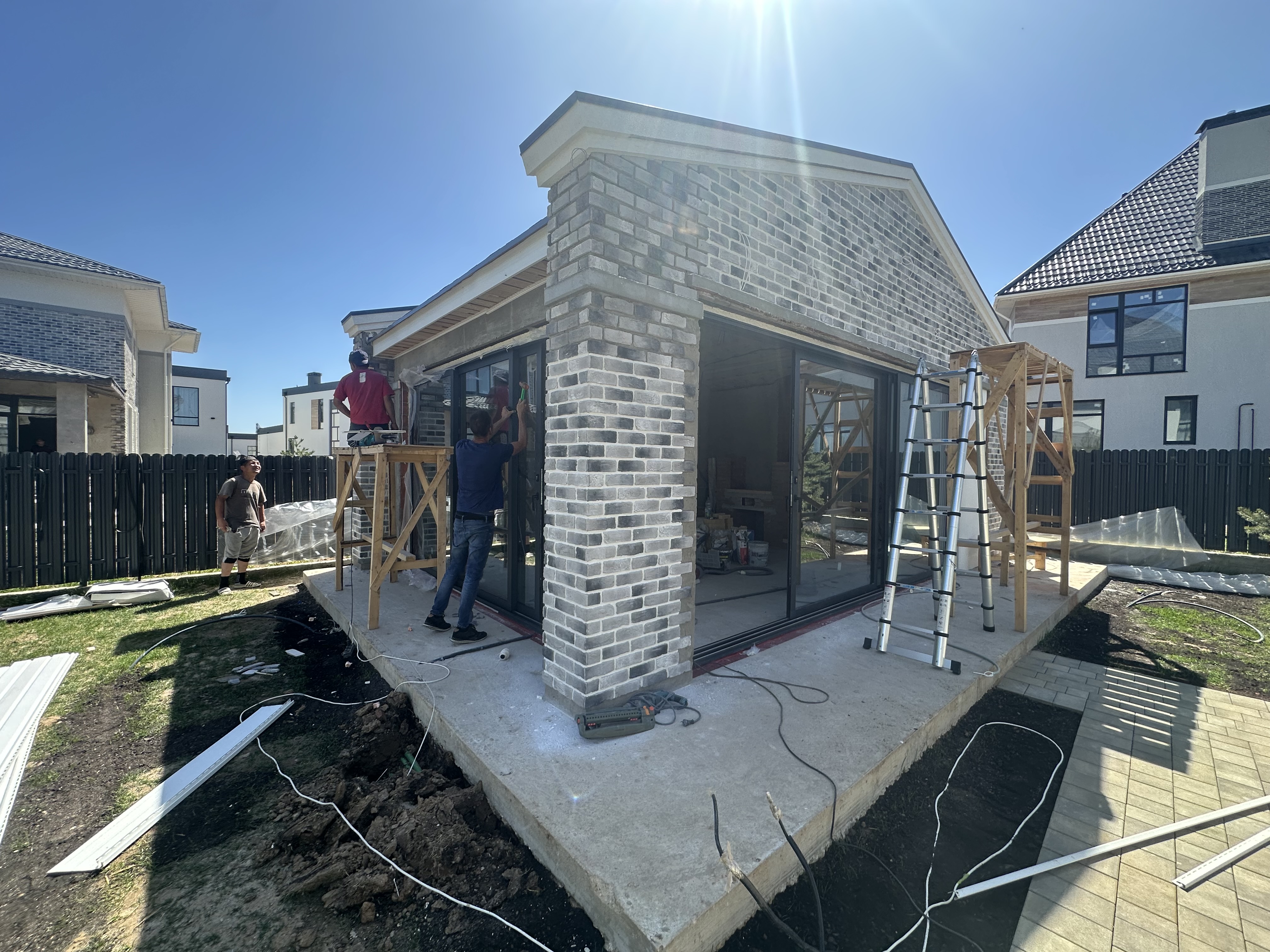 Остекление беседки тёплыми раздвижными дверями позволило создать круглогодичное, светлое и защищённое пространство для отдыха и встреч на свежем воздухе.