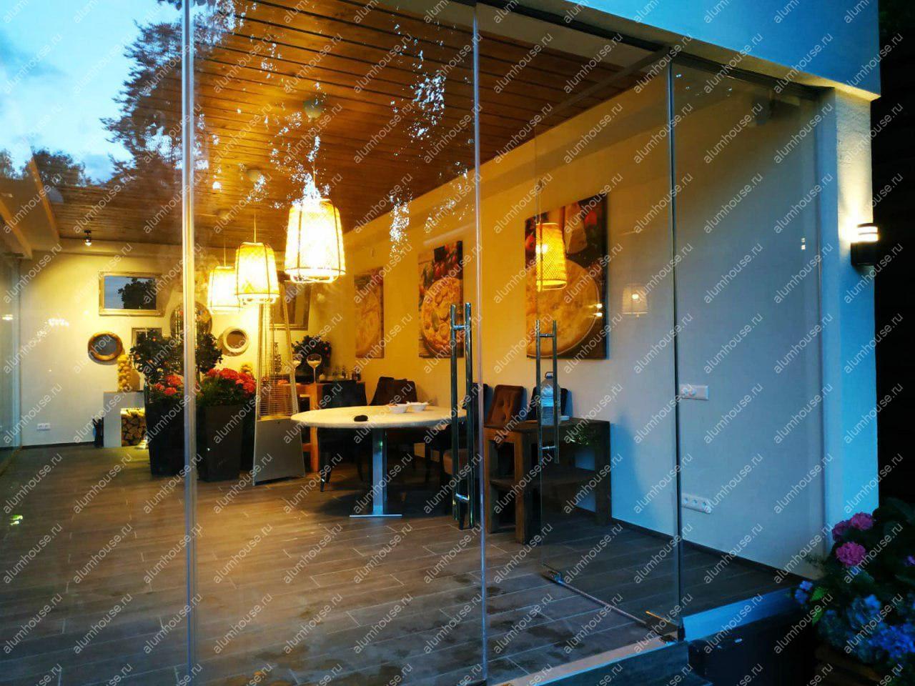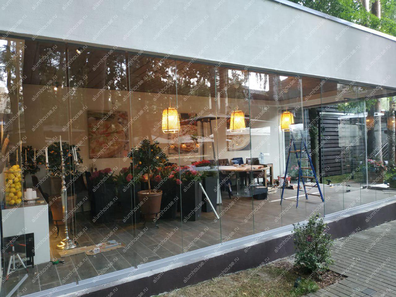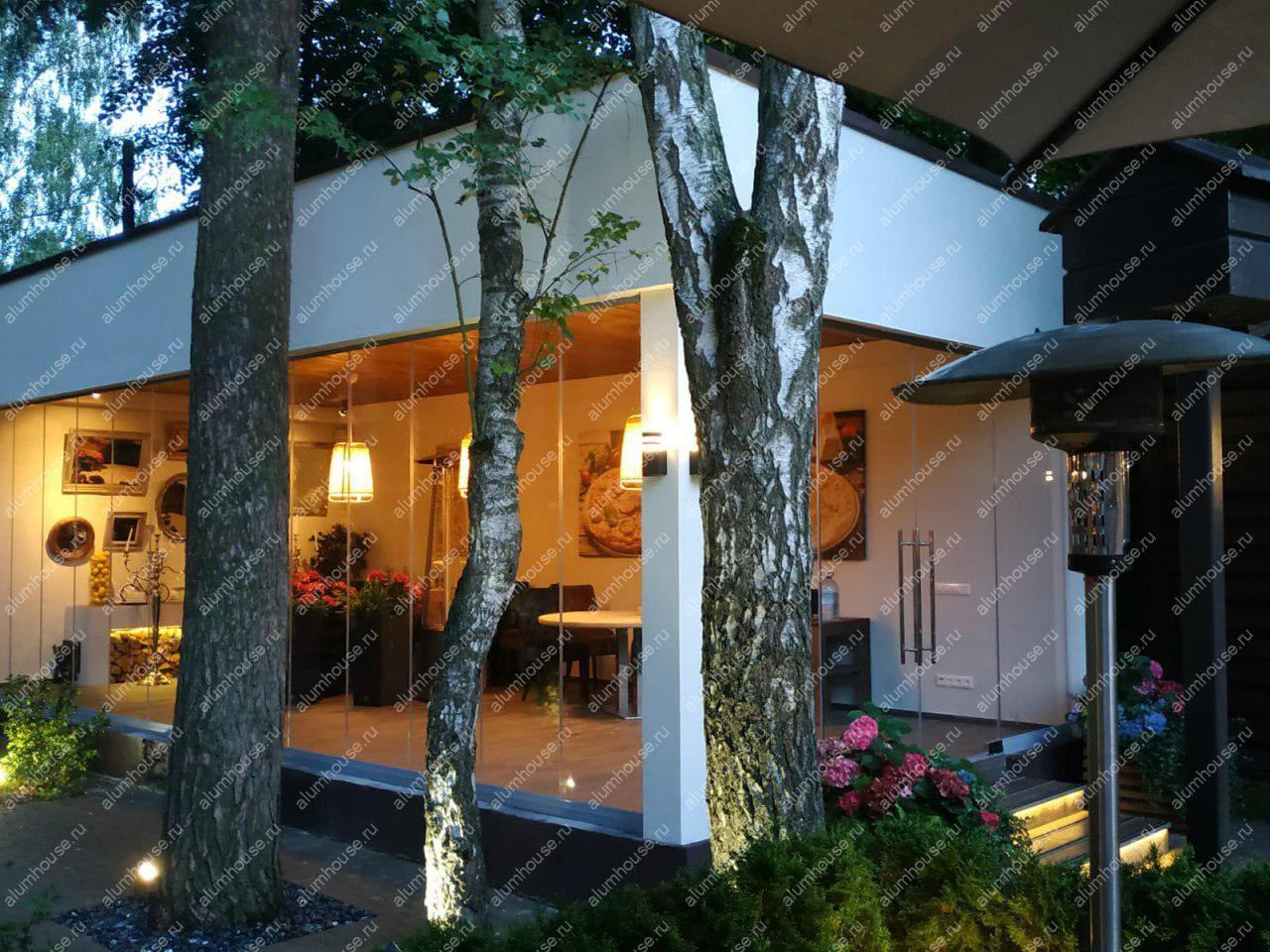 Безрамное панорамное остекление беседки стало одной из основных задач при их строительстве. Остекление в пол делают пространство открытым, светлым и визуально просторным.