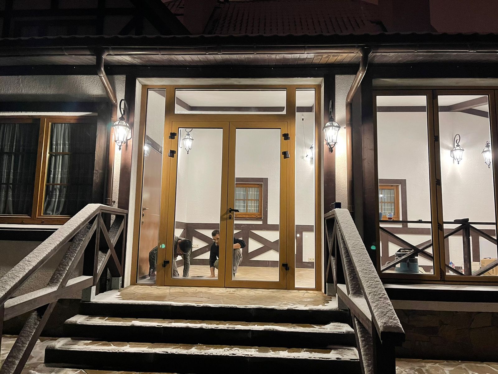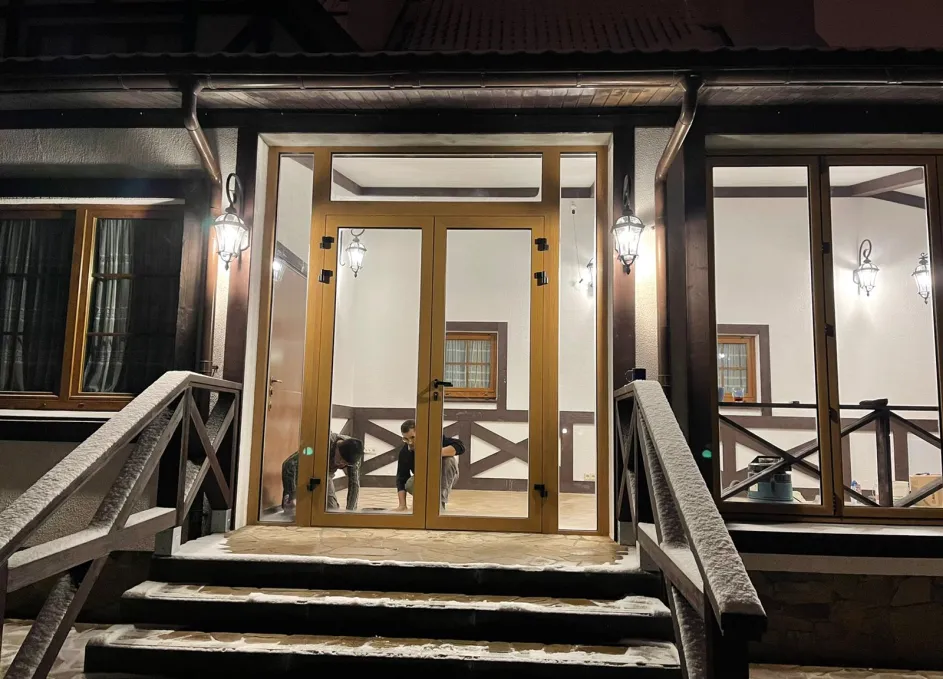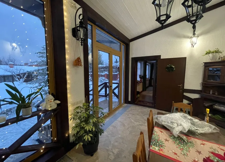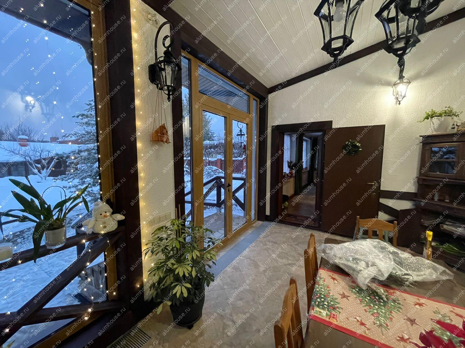 В рамках проекта веранда оформлена алюминиевой входной группой и панорамными складными окнами‑гармошка, что позволяет максимально открыть проёмы и объединить внутреннее пространство с участком в тёплый сезон. Узкие профили и крупноформатное остекление повышают уровень естественного света и сохраняют минималистичную эстетику фасада. Конструкции рассчитаны на наружную эксплуатацию и устойчивы к погодным воздействиям, обеспечивая удобство ежедневного использования.