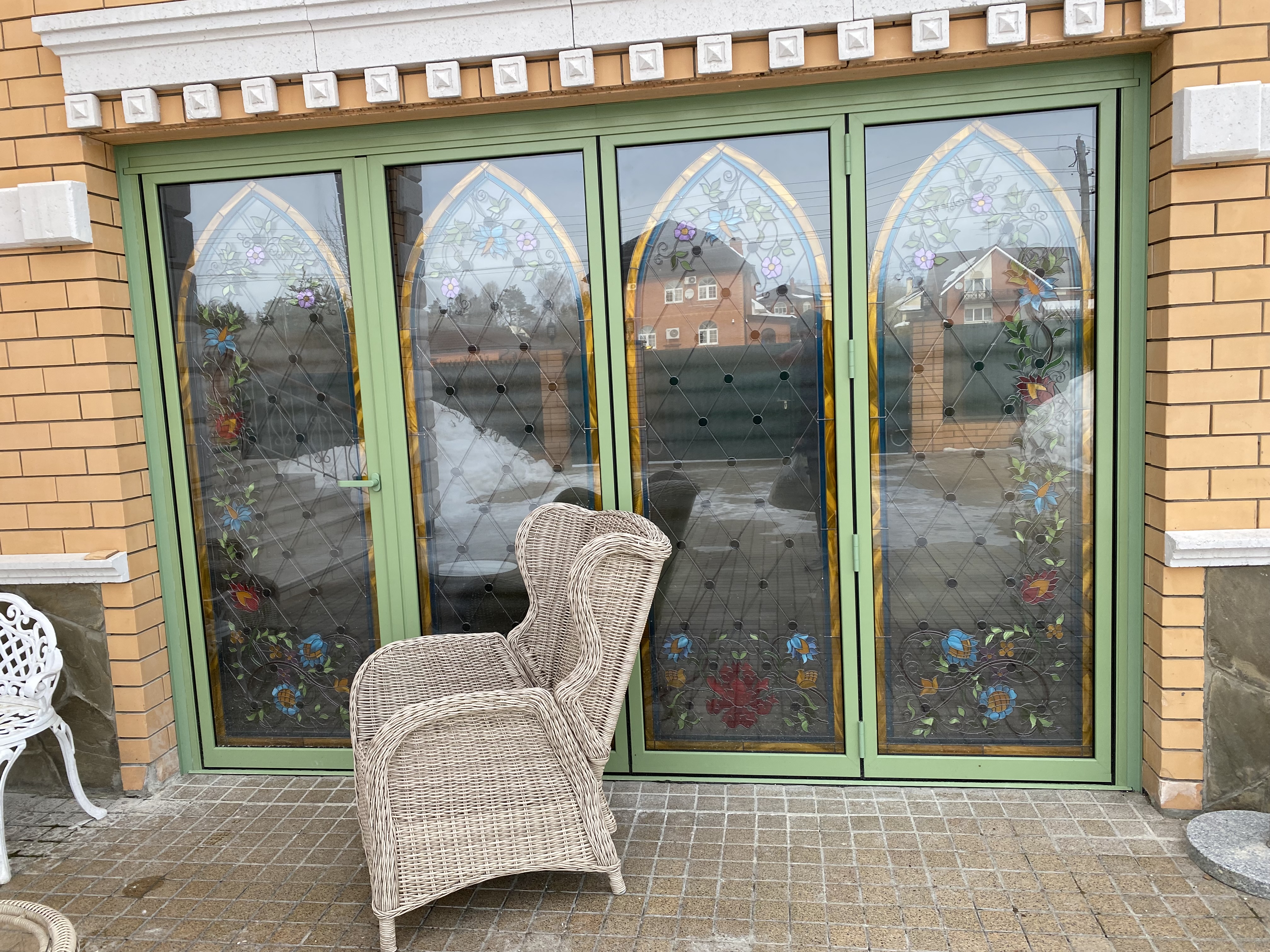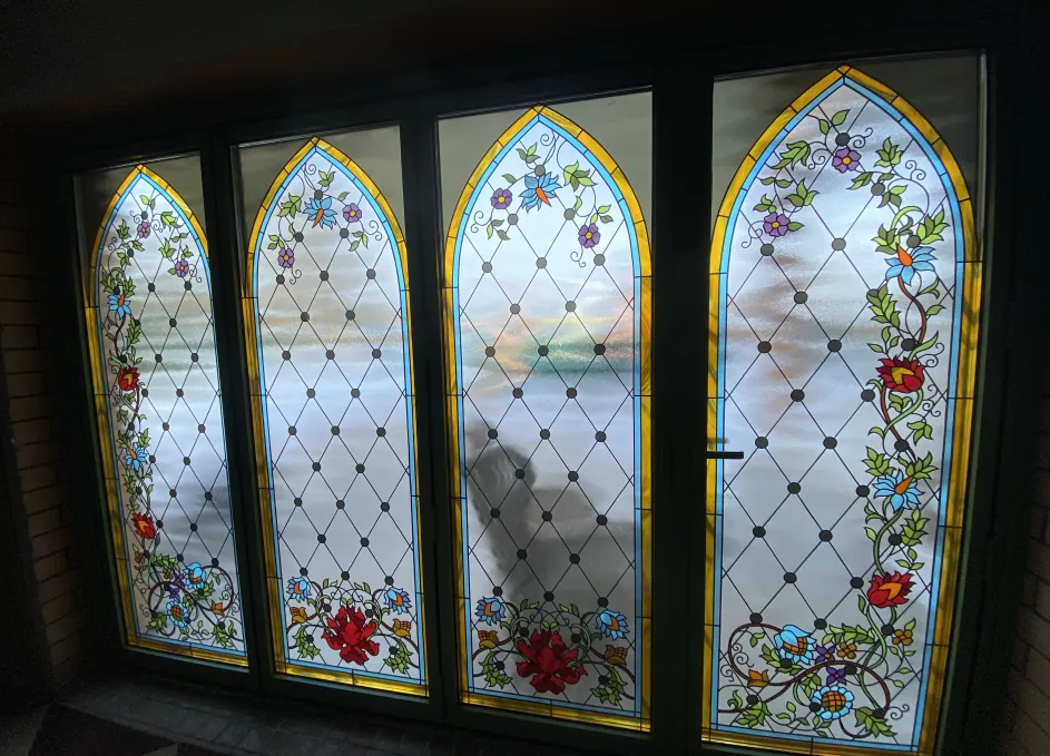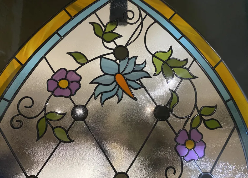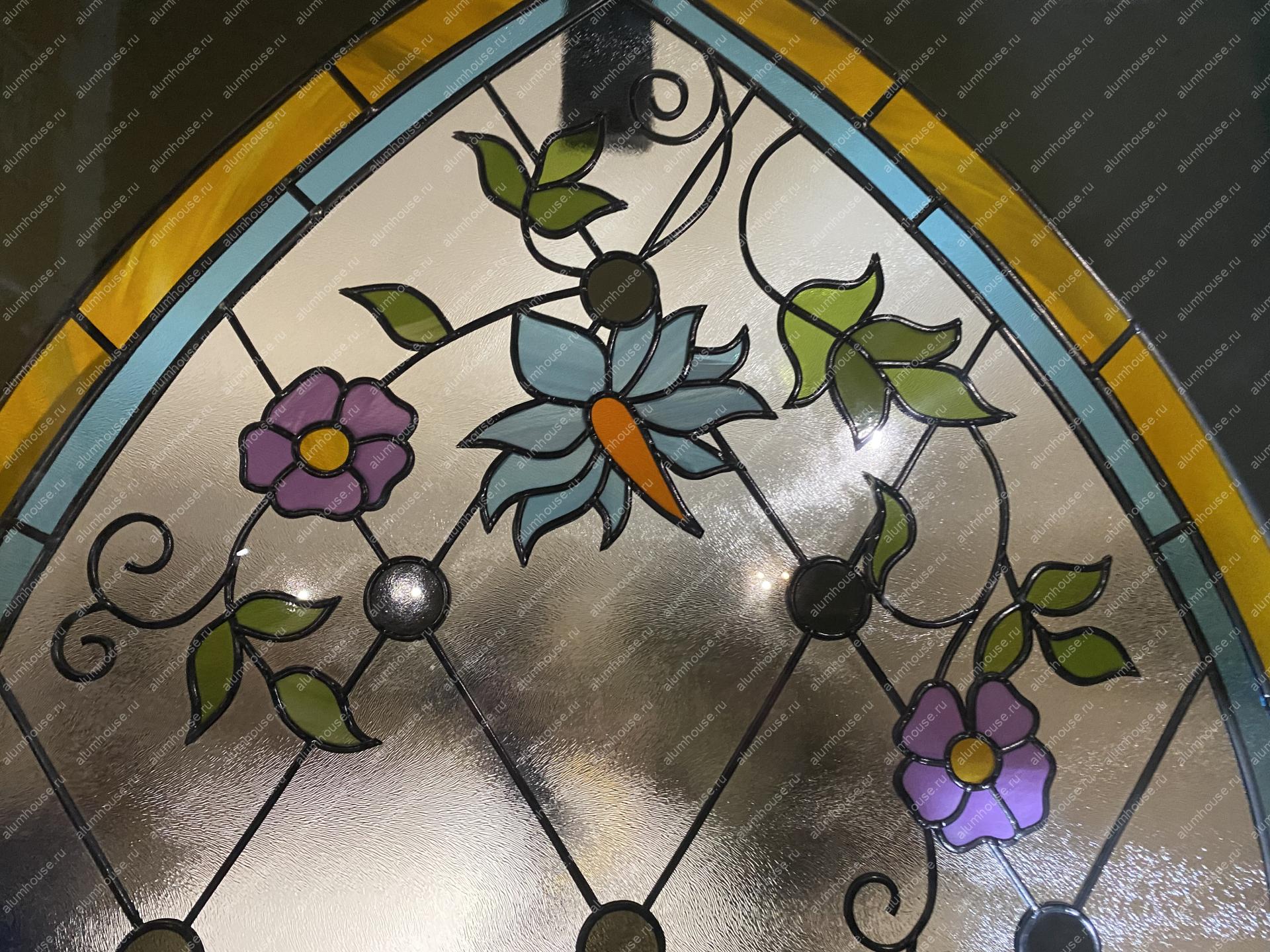 Витраж интегрирован внутрь стеклопакета: используется закалённое или ламинированное стекло, возможны техники пескоструя или фьюзинга для получения устойчивого орнамента без ухода за наружными накладками. Такое решение повышает безопасность и облегчает обслуживание, а также сохраняет декоративный эффект в любых погодных условиях. Контур уплотнений и термовставки обеспечивают тепло‑ и шумоизоляцию, герметичность и стойкость к влаге.