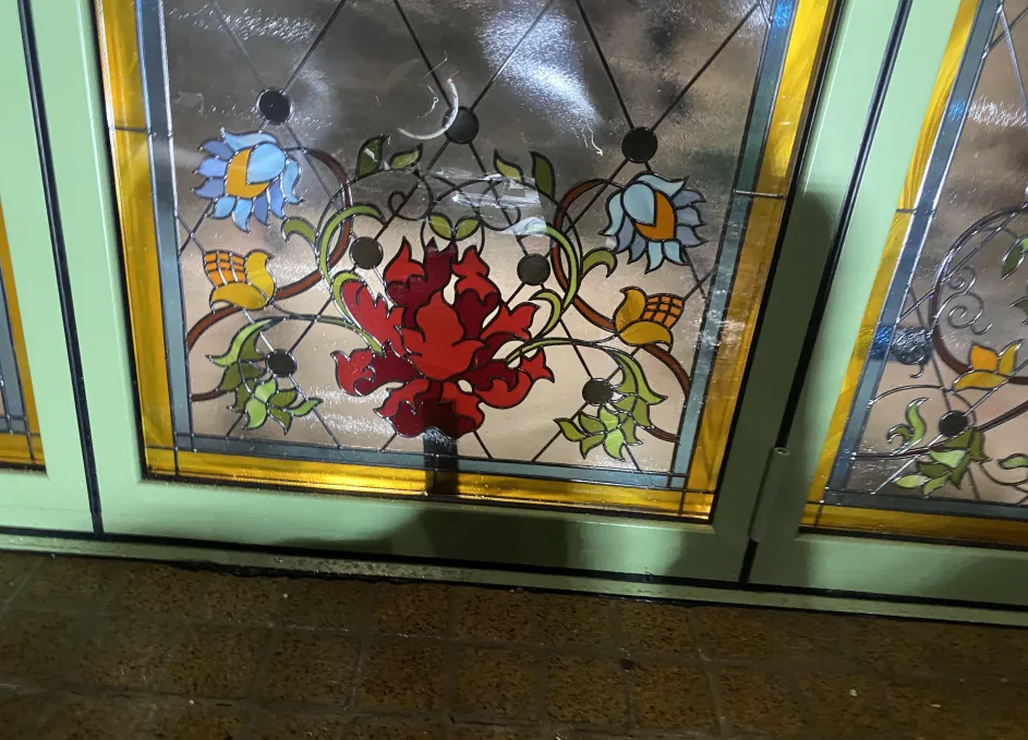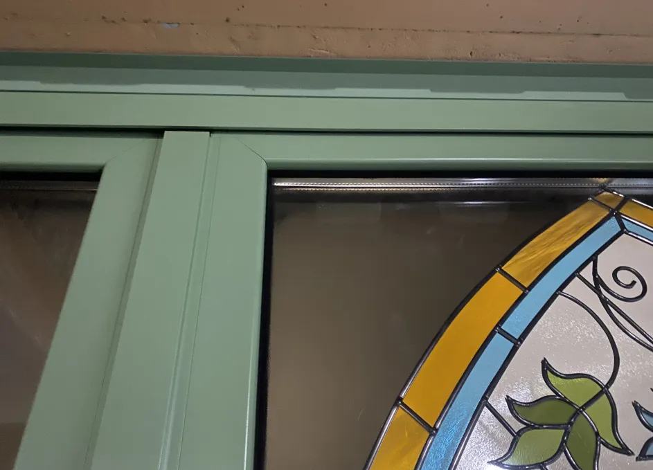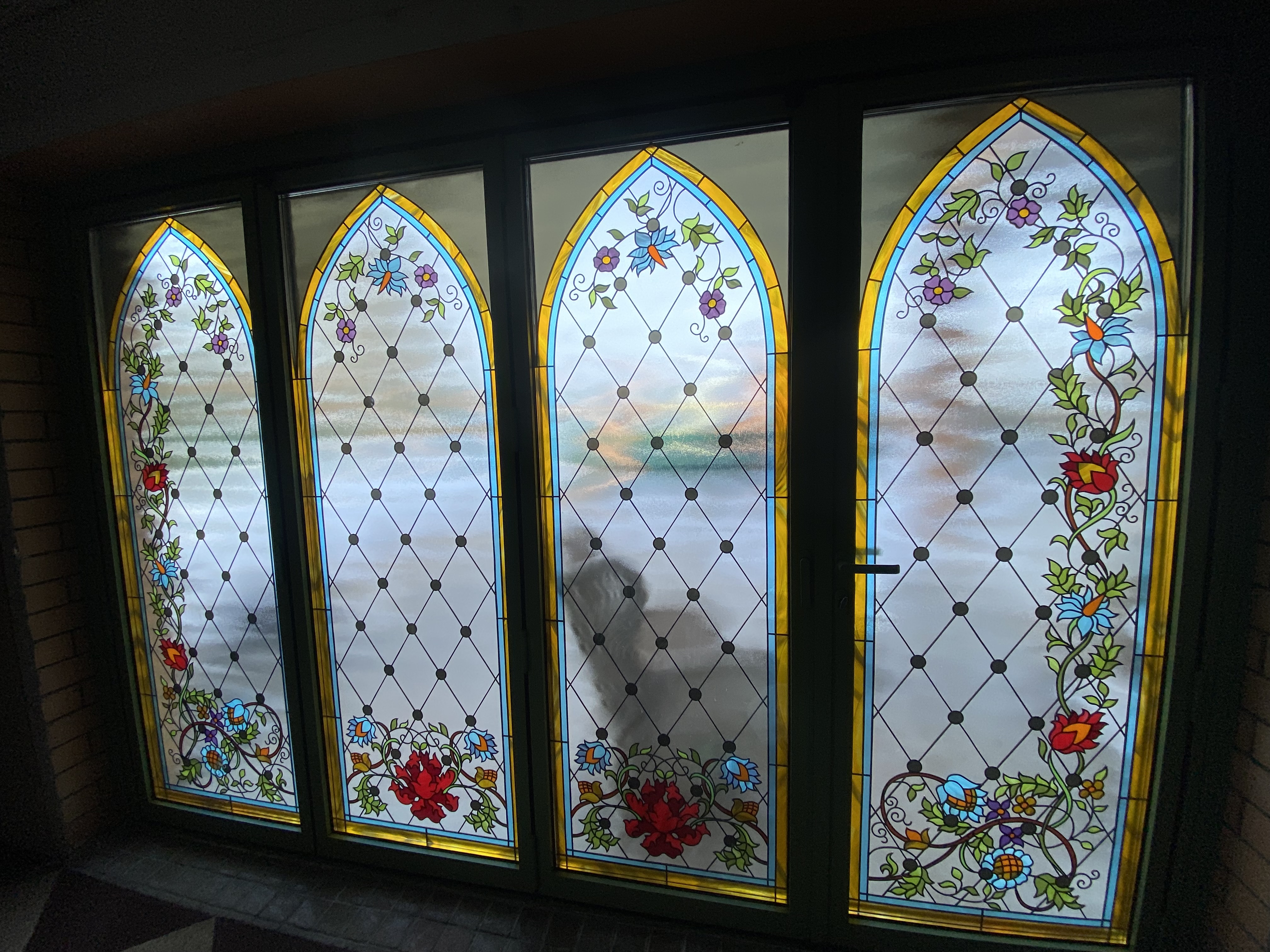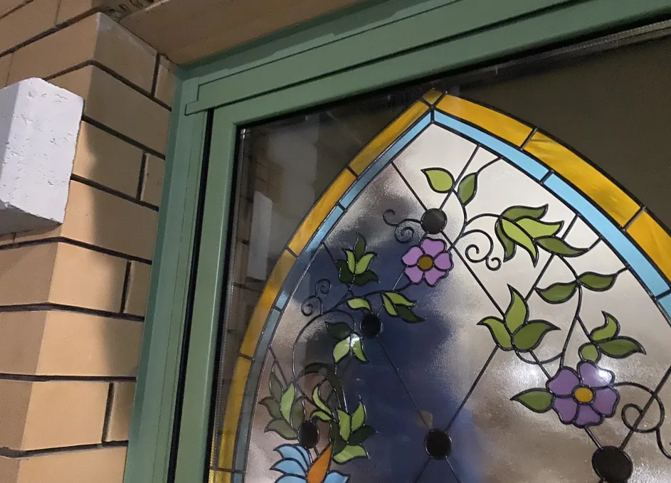 Витраж интегрирован внутрь стеклопакета: используется закалённое или ламинированное стекло, возможны техники пескоструя или фьюзинга для получения устойчивого орнамента без ухода за наружными накладками. Такое решение повышает безопасность и облегчает обслуживание, а также сохраняет декоративный эффект в любых погодных условиях. Контур уплотнений и термовставки обеспечивают тепло‑ и шумоизоляцию, герметичность и стойкость к влаге.