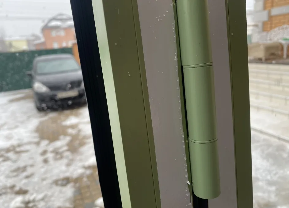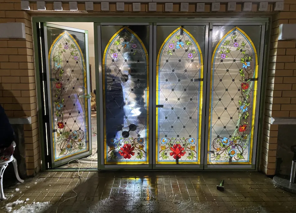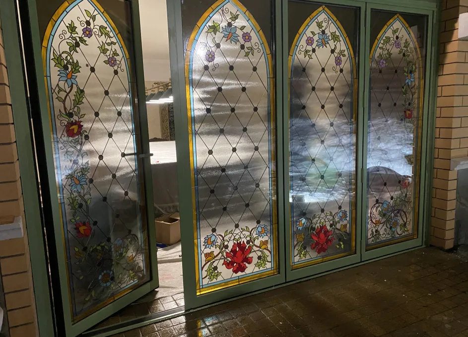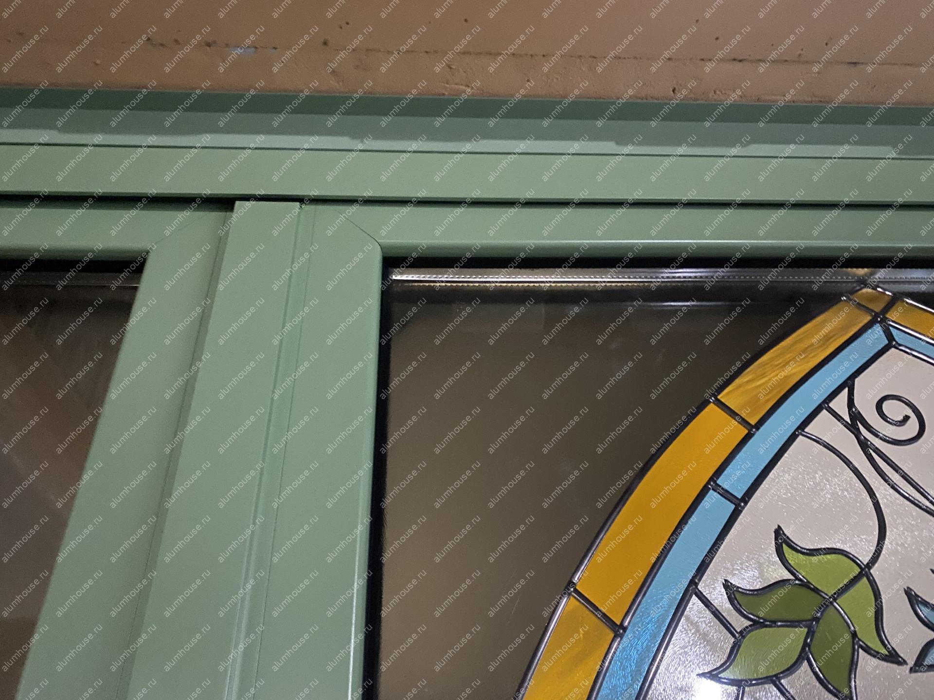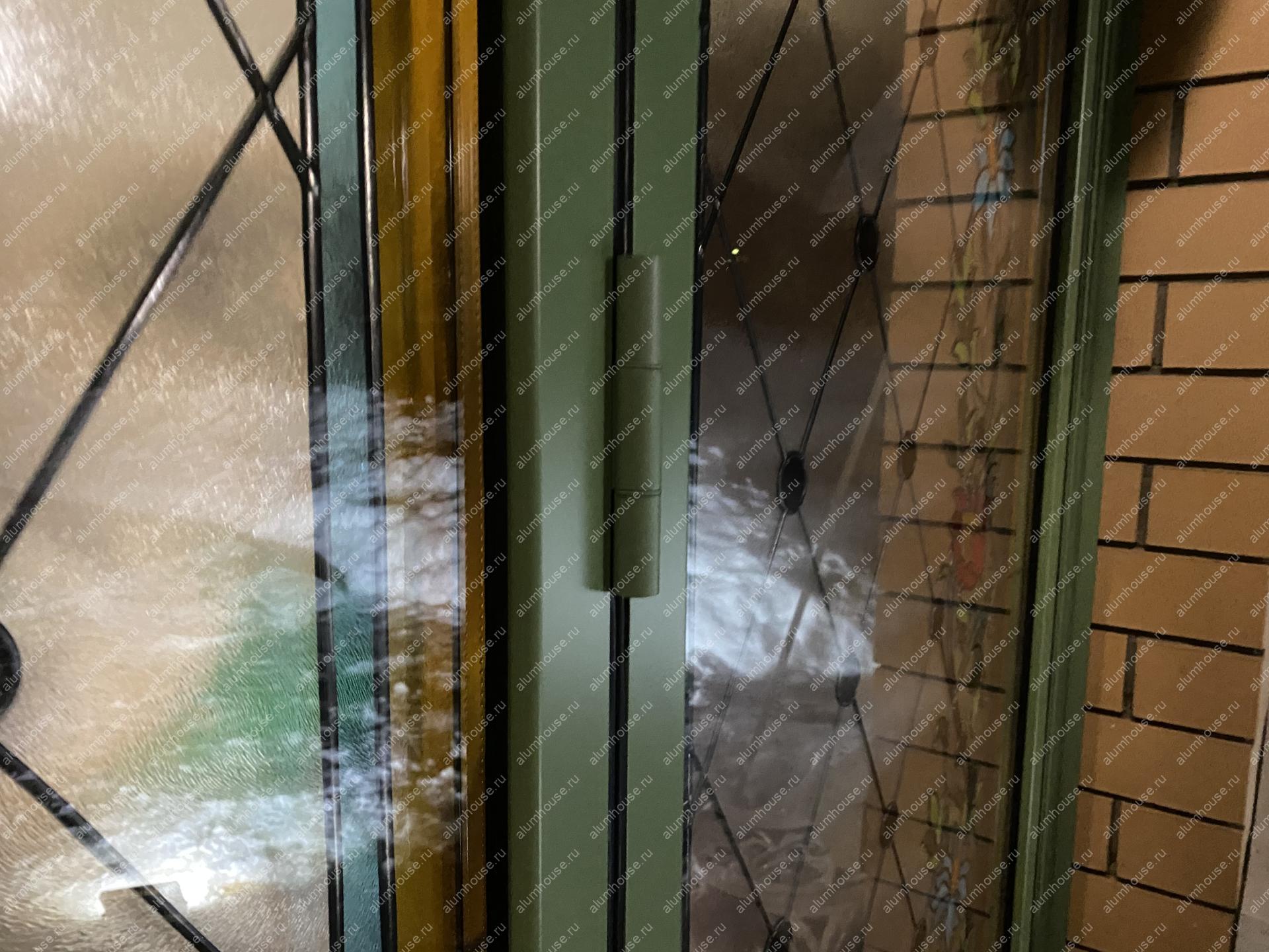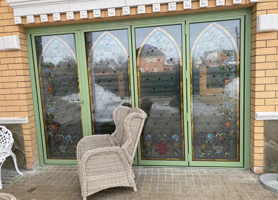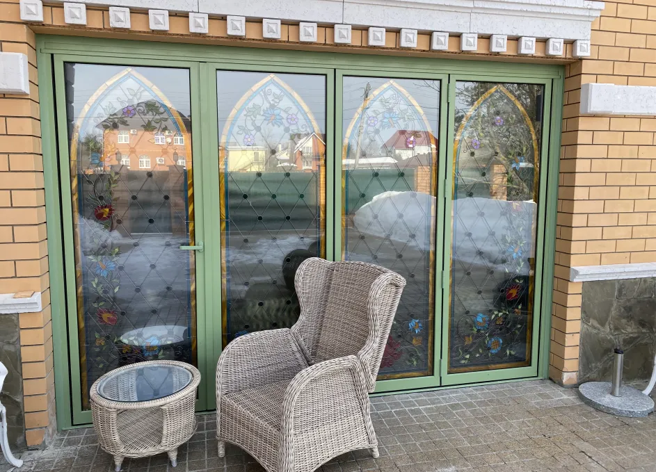 Система поддерживает одностороннее складывание створок и «проходную» створку для ежедневного доступа, при этом усиленные ролики гарантируют плавный ход и равномерное распределение нагрузки. Профили окрашиваются по палитре RAL, доступны матовые, глянцевые и текстурные покрытия под архитектуру объекта. Итогом стала выразительная и функциональная дверная группа, объединяющая панорамное раскрытие пространства с художественным витражным акцентом.