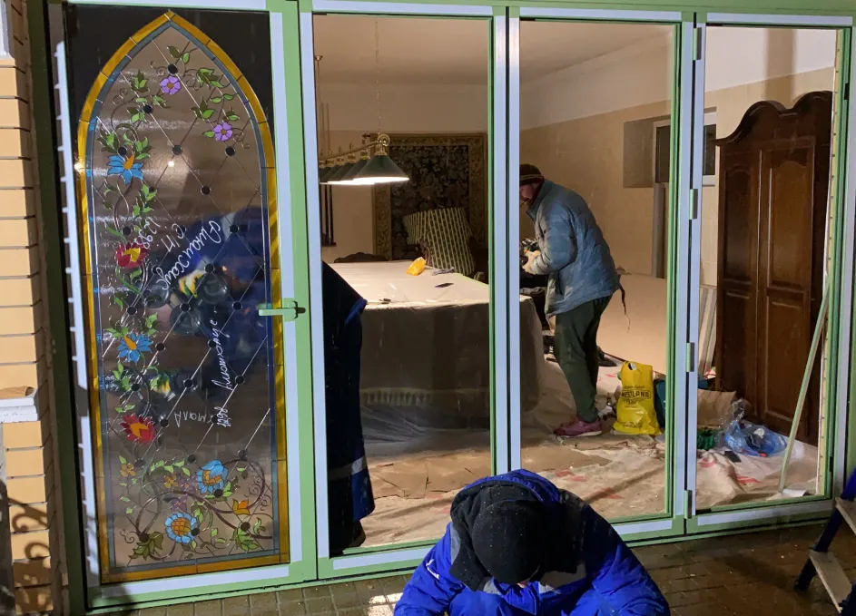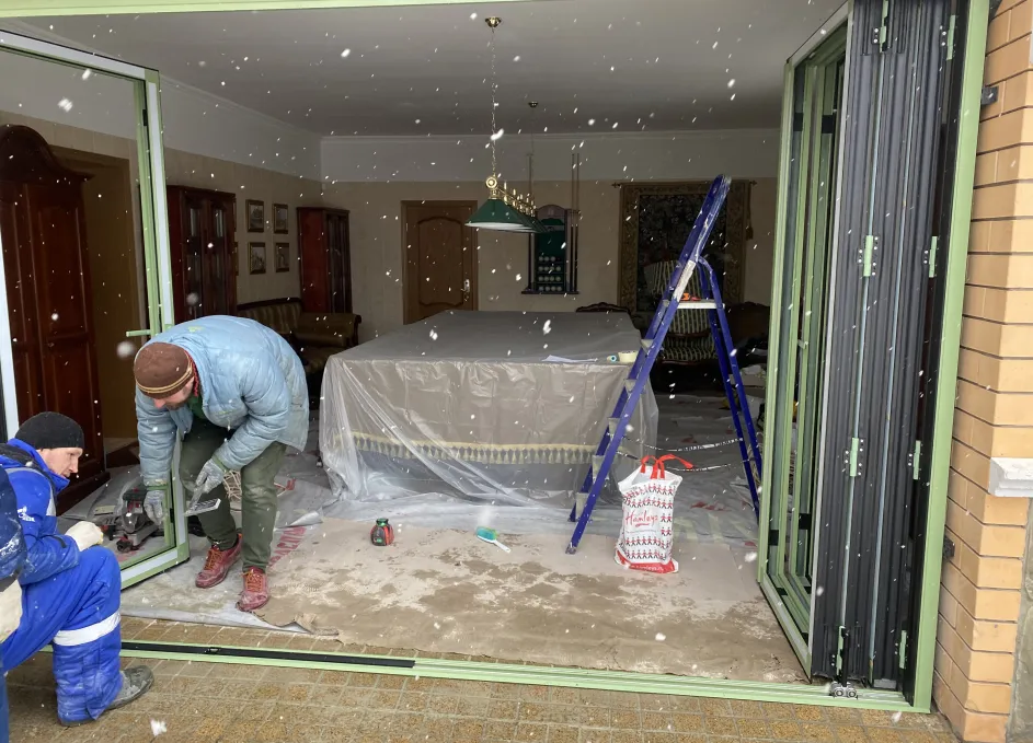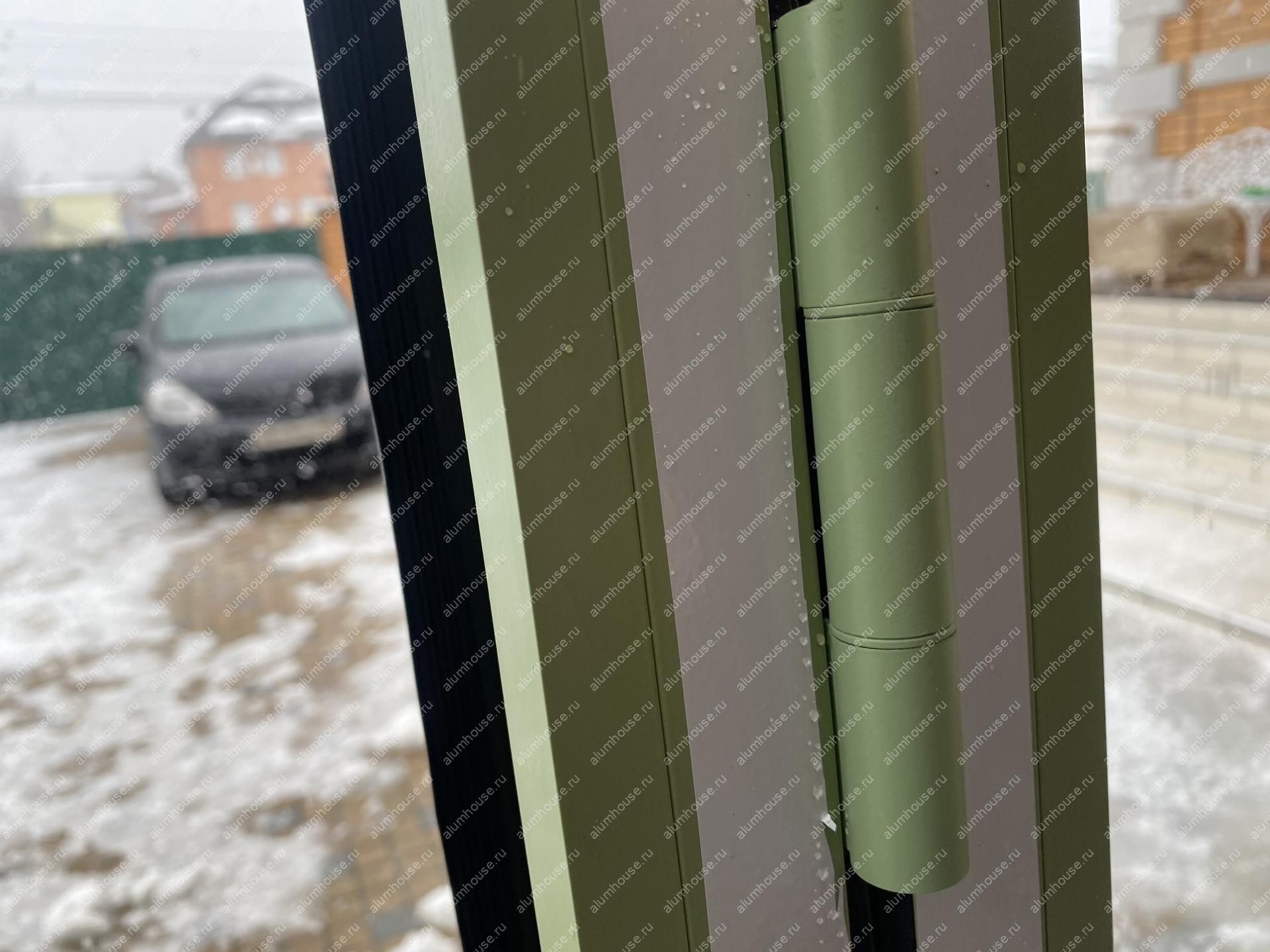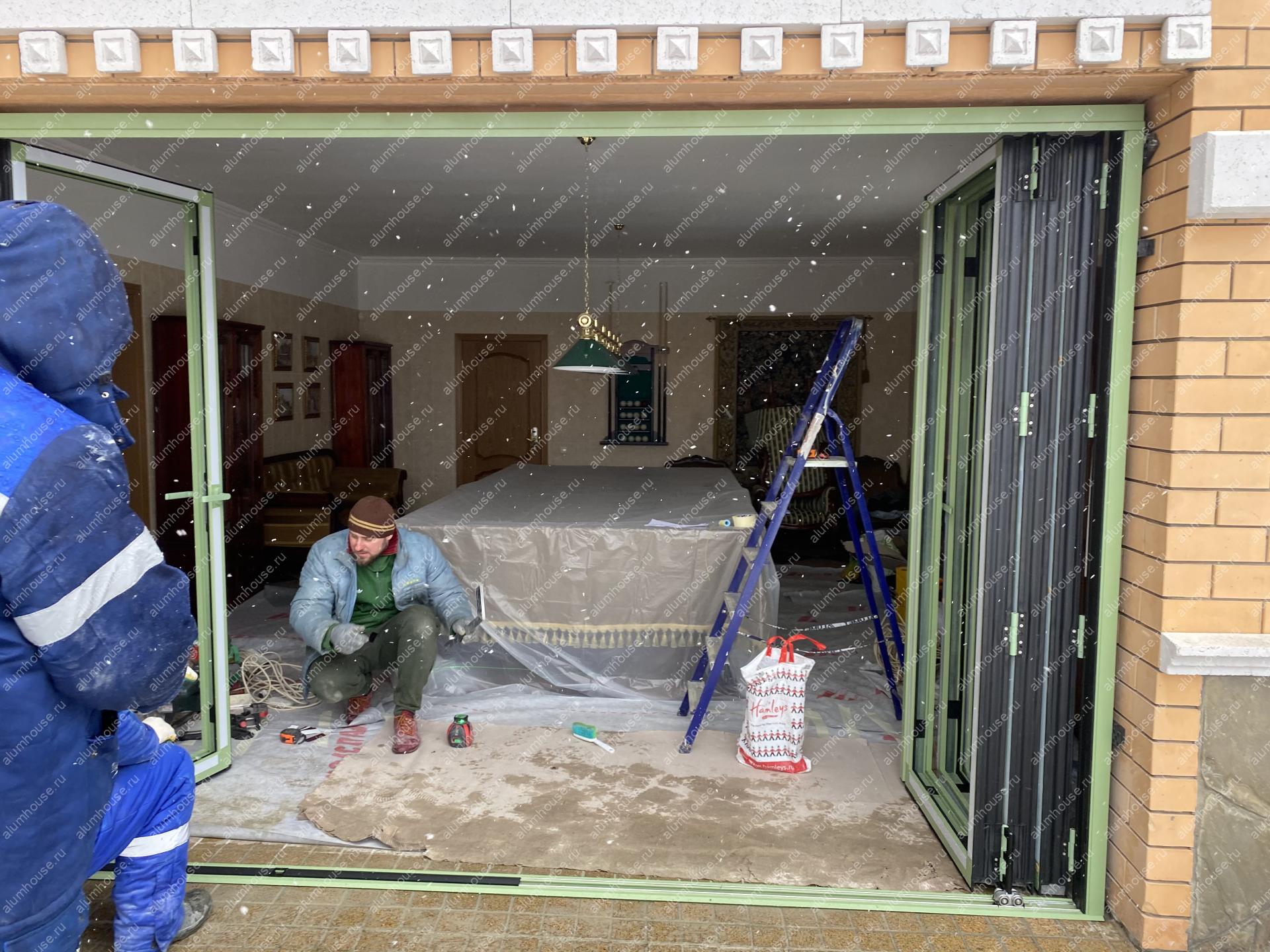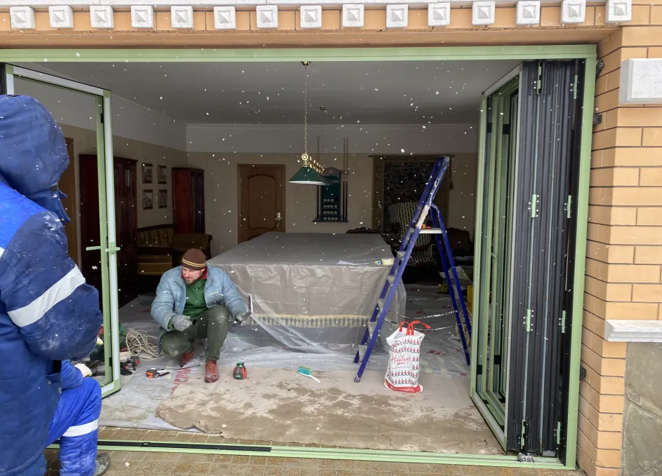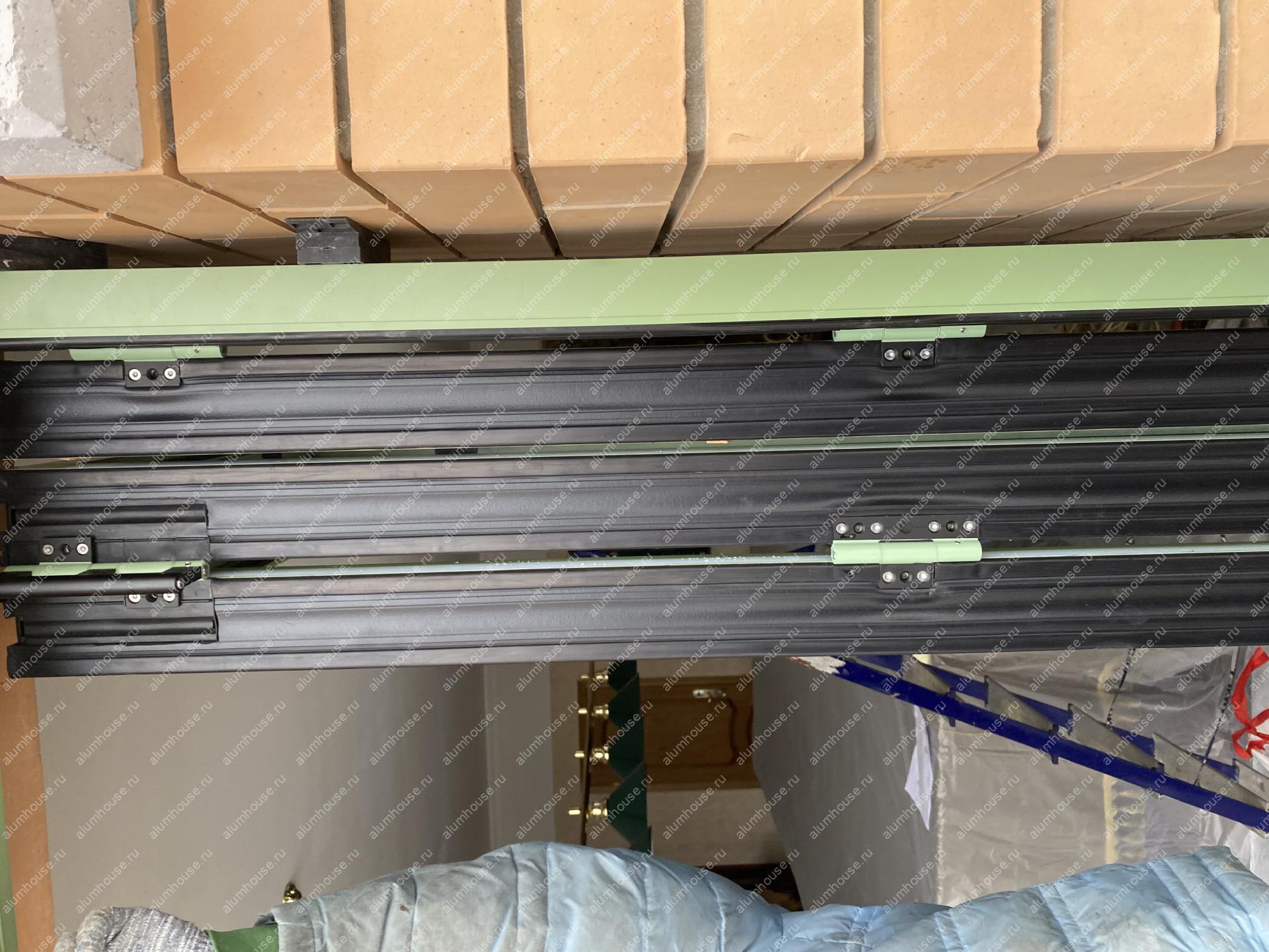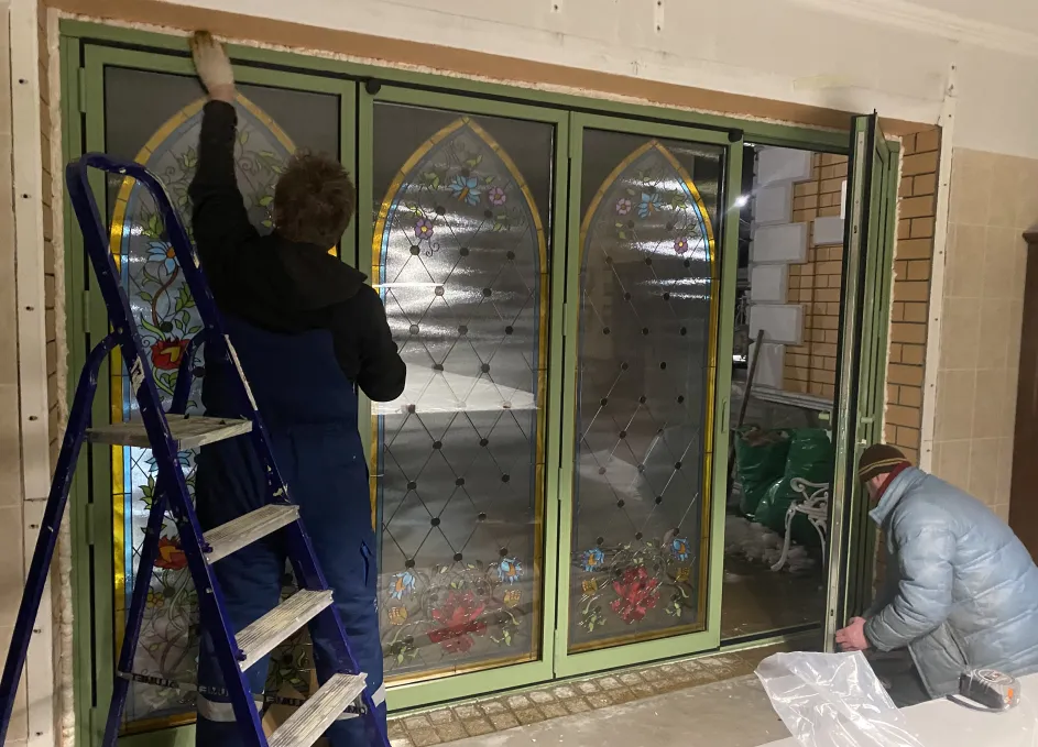 Система поддерживает одностороннее складывание створок и «проходную» створку для ежедневного доступа, при этом усиленные ролики гарантируют плавный ход и равномерное распределение нагрузки. Профили окрашиваются по палитре RAL, доступны матовые, глянцевые и текстурные покрытия под архитектуру объекта. Итогом стала выразительная и функциональная дверная группа, объединяющая панорамное раскрытие пространства с художественным витражным акцентом.