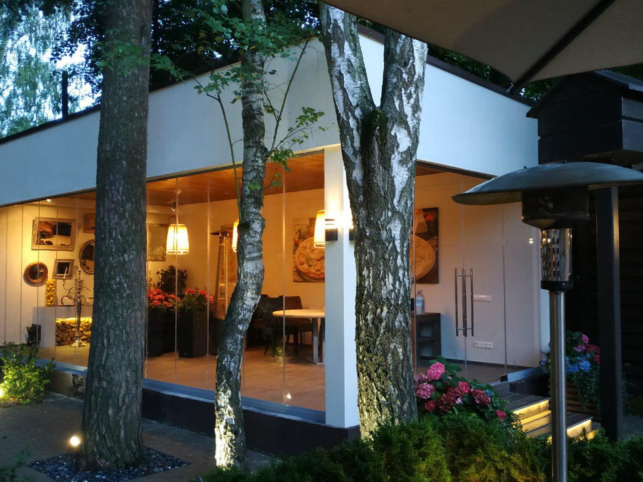 В проекте реализована панорамная складная система из тёплого алюминия со стеклопакетами, в которых витражный рисунок выполнен в декоративной технике для устойчивости и долговечности при ежедневной эксплуатации. Компоновка створок позволяет компактно складывать полотна у стены и освобождать до 90% проёма, сохраняя удобный проход и визуальную лёгкость фасада. Узкие видимые профили и крупноформатное остекление обеспечивают высокий уровень естественного света и современную эстетику.
