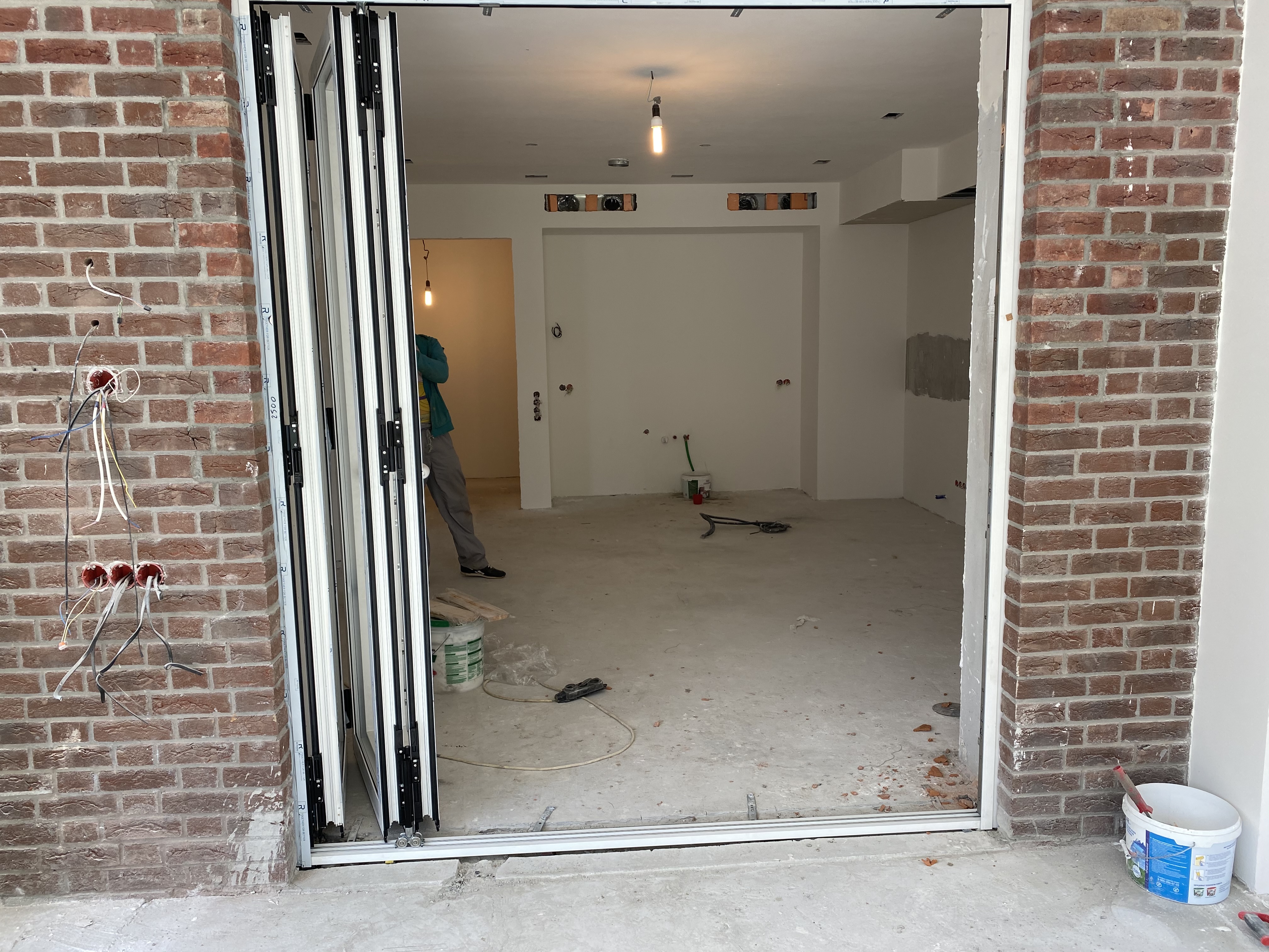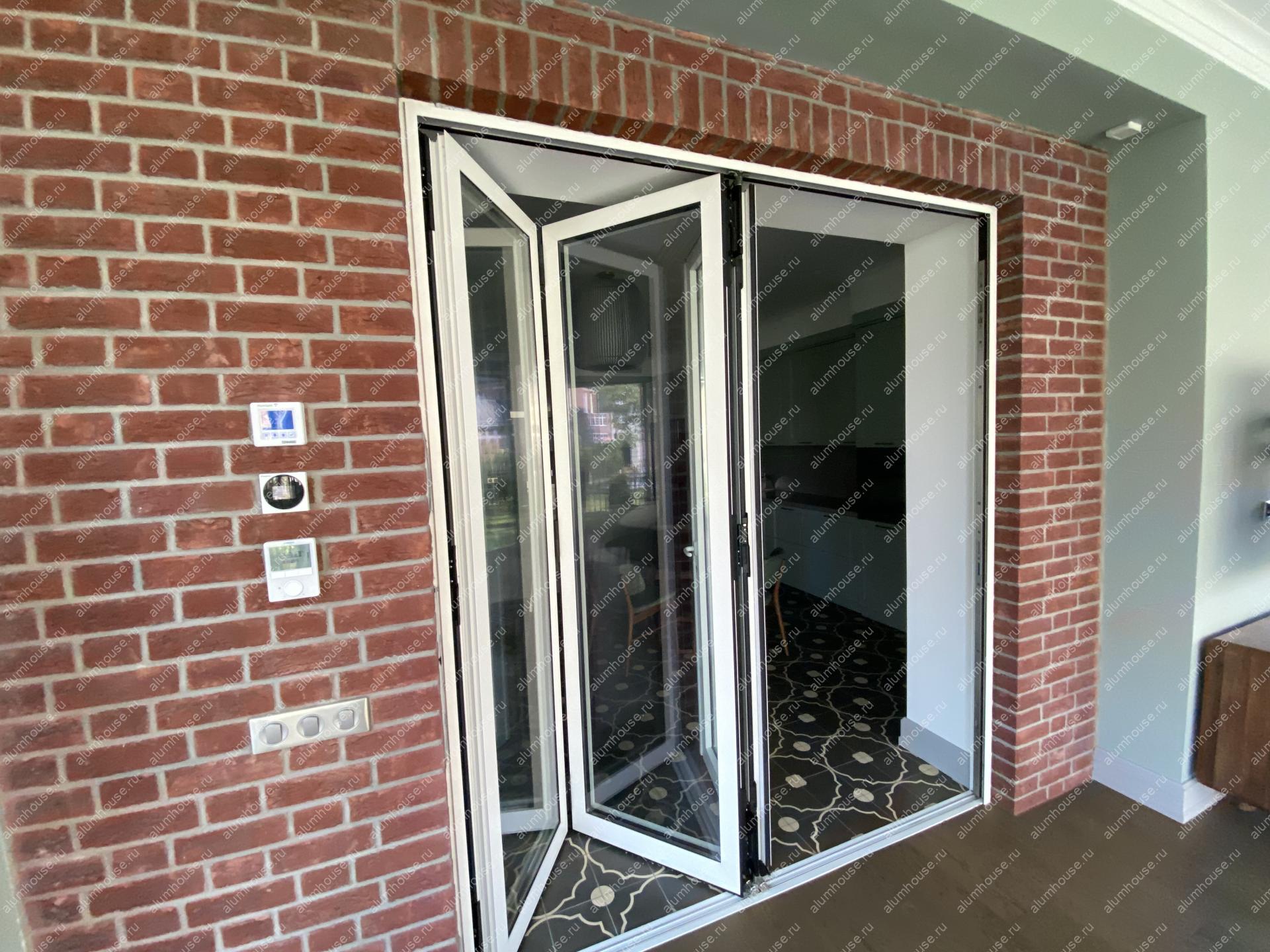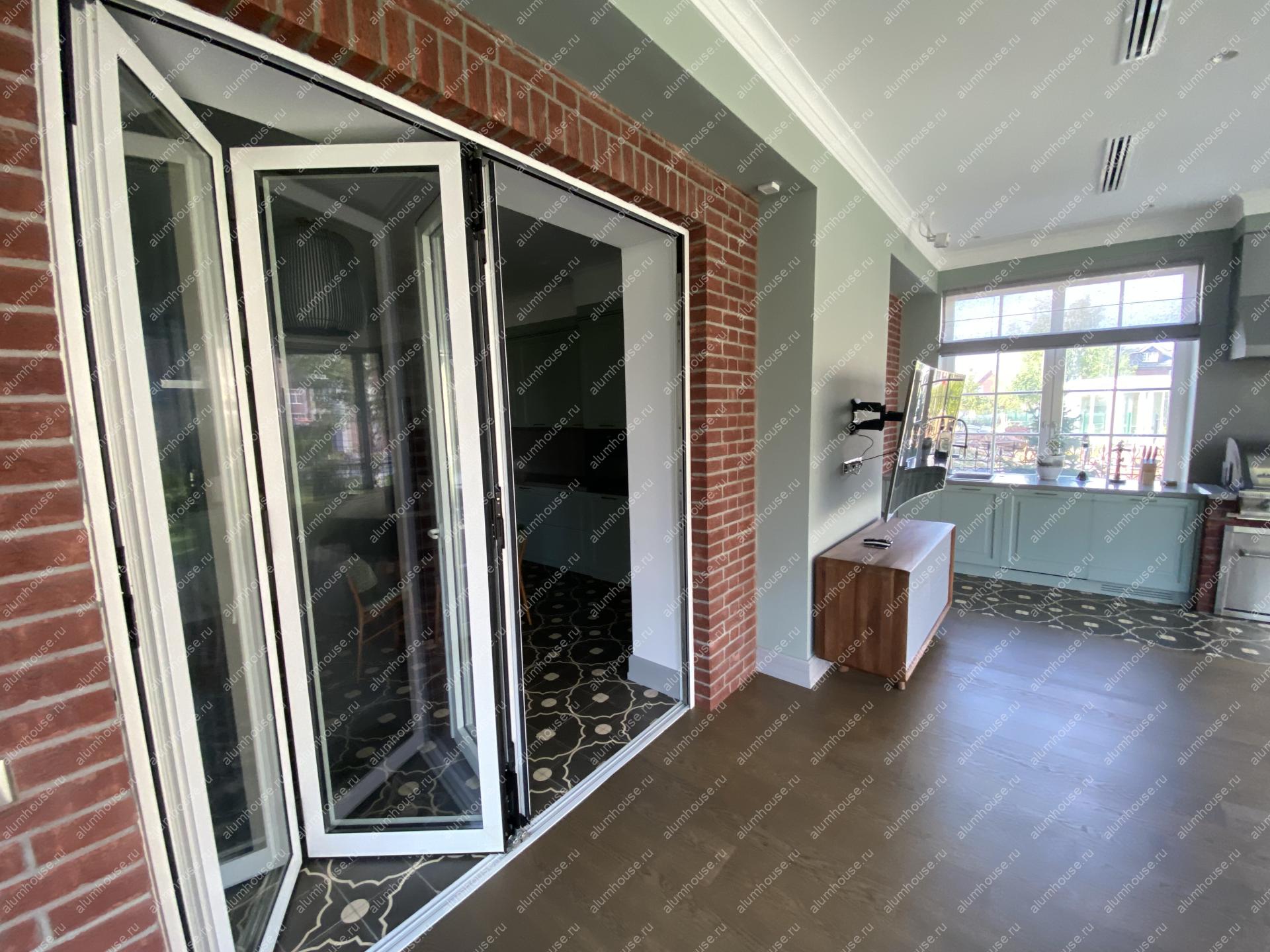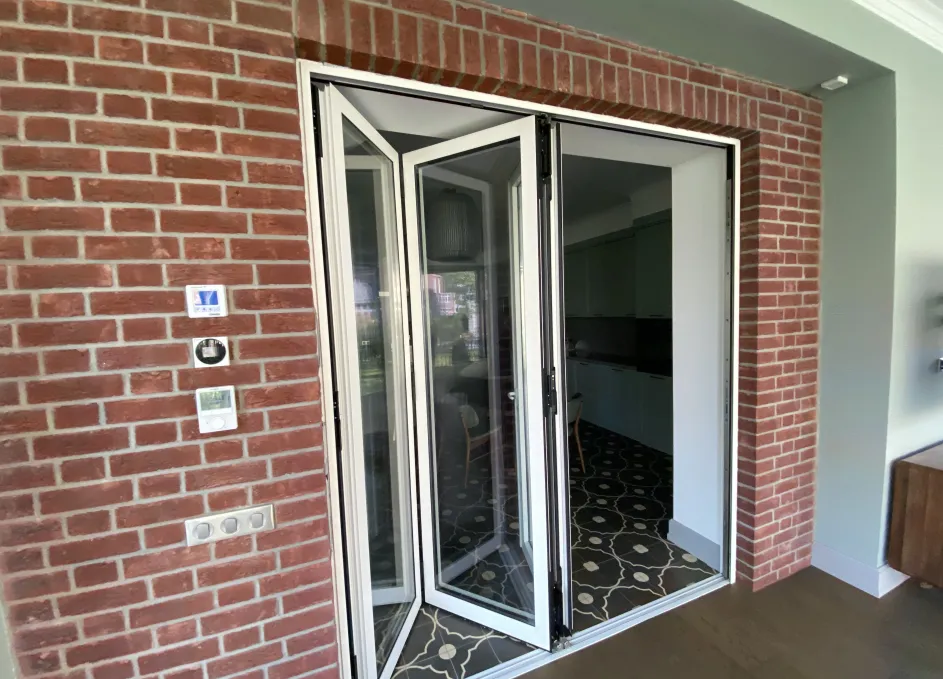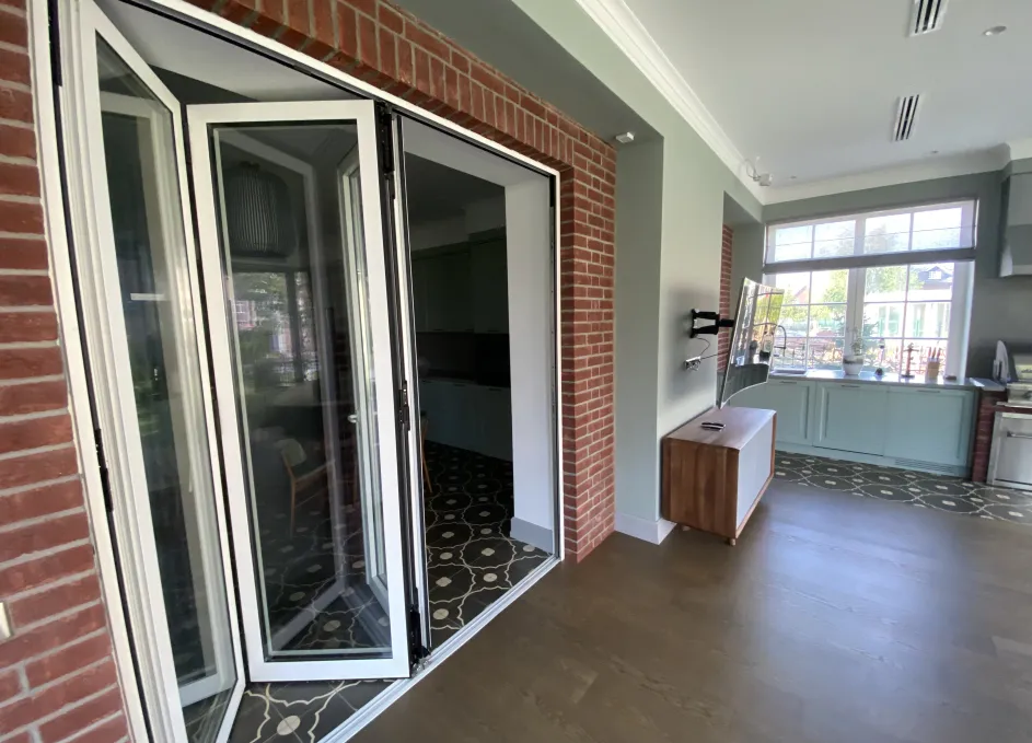 В проекте реализована панорамная складная система из трёх створок, которая компактно складывается у стены и освобождает до 90–95% светового проёма для удобной связи с террасой или садом. Узкие алюминиевые профили и крупноформатное остекление обеспечивают высокий уровень естественного света, визуальную лёгкость и современную эстетику. Конструкция рассчитана на наружную эксплуатацию: применяются термовставки, уплотнители и безопасное стекло для теплосбережения, герметичности и долговечности.