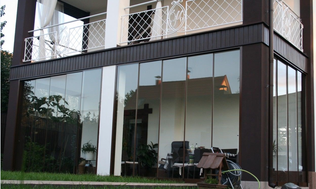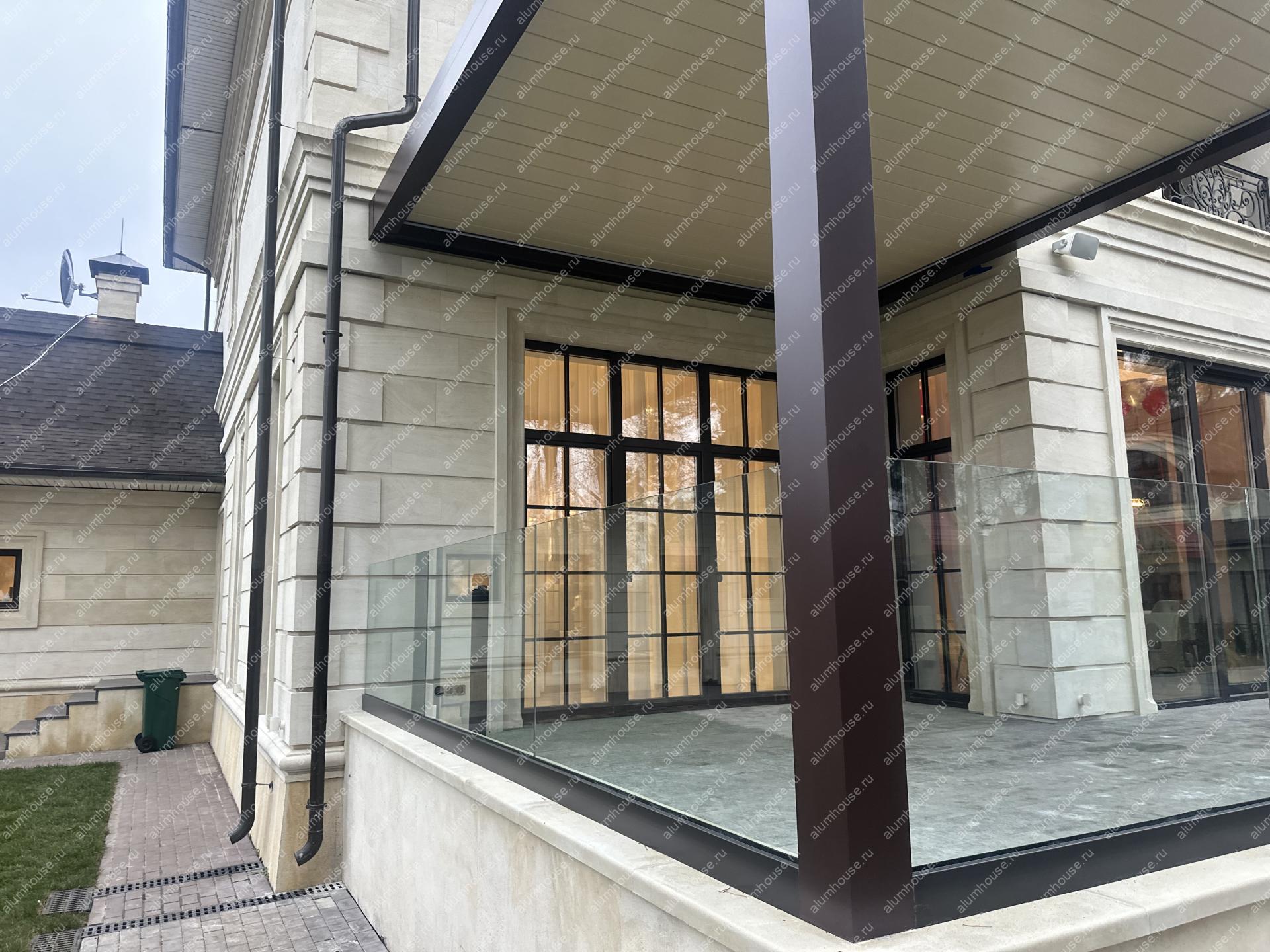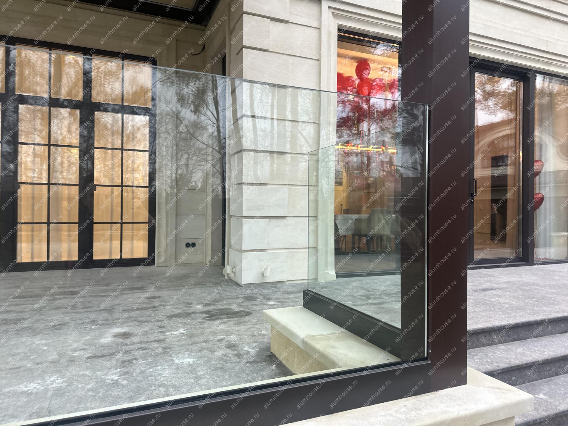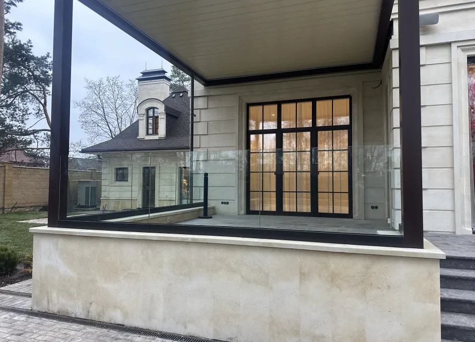 Профиль смонтирован линейно и по уровню, что обеспечило ровную геометрию линии ограждения и стабильную фиксацию полотен. Узлы примыкания выполнены с уплотнением и дренажом для защиты кромок стекла от влаги и загрязнений. Конфигурация выдержана в минималистичной эстетике без поручней, подчёркивая лёгкость и прозрачность перголы.