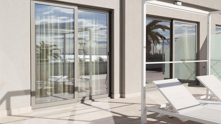 Популярный сегодня прямолинейный дизайн — визуальное достоинство раздвижных дверей Alumil Smartia S350, предназначенных для теплого остекления.
