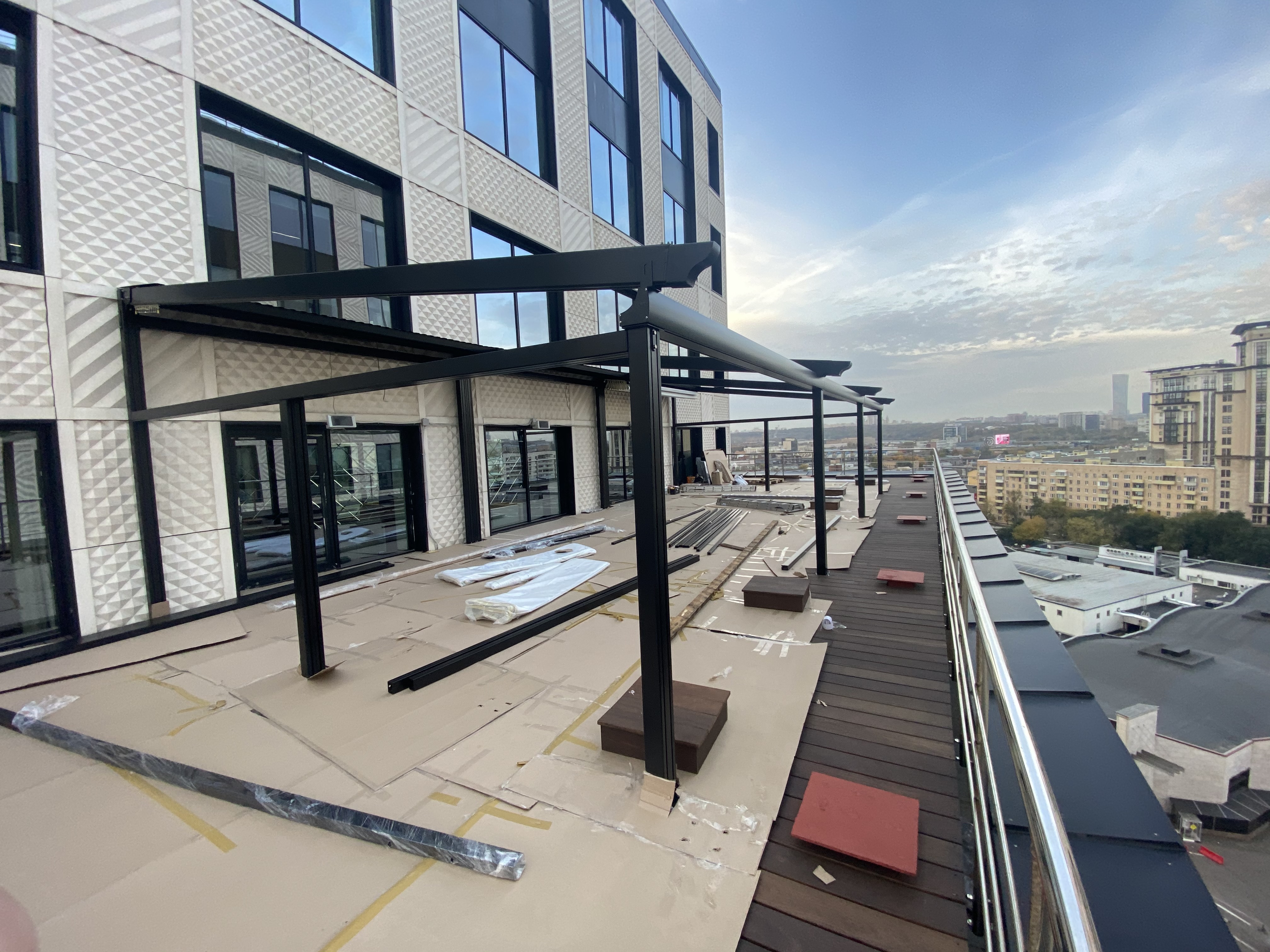 Отдельностоящая пергола, монтируется на открытых площадках или вплотную к фасаду без следов крепежа.