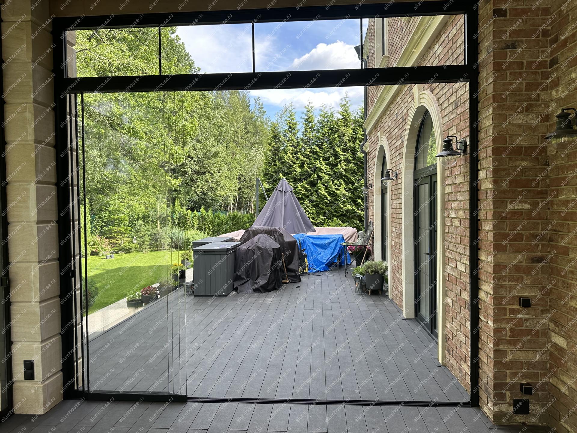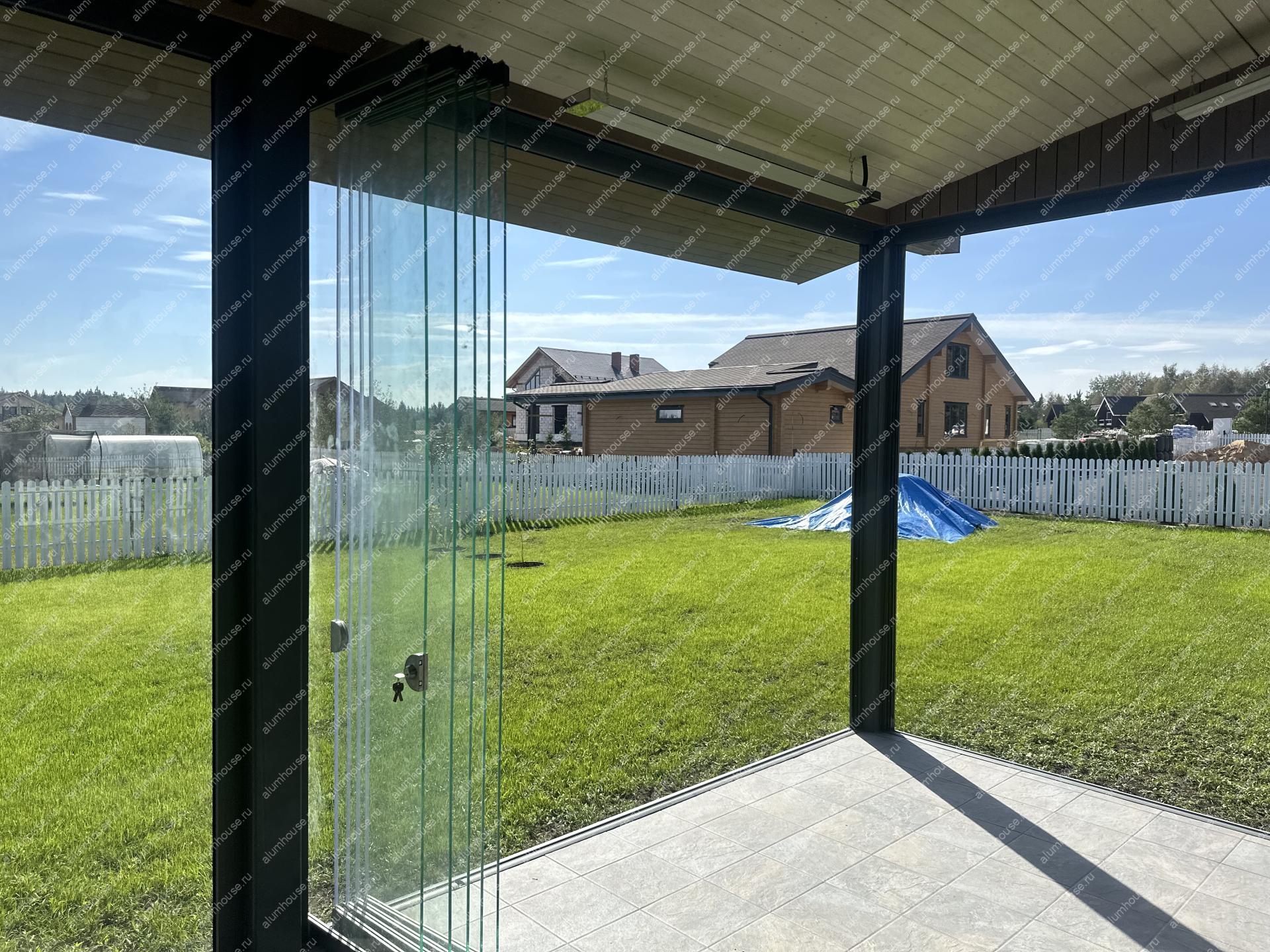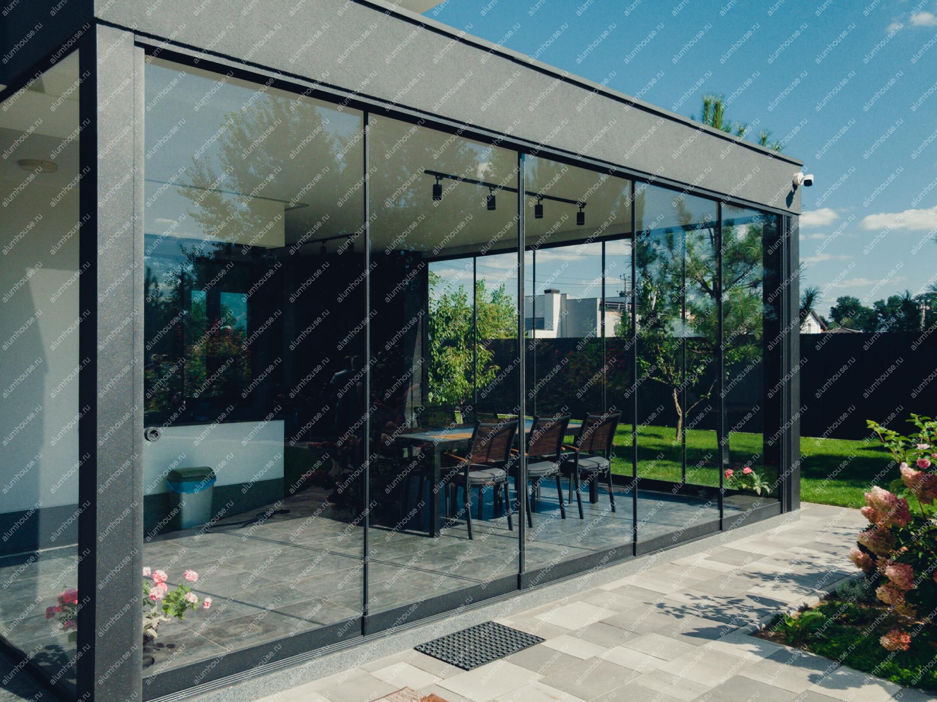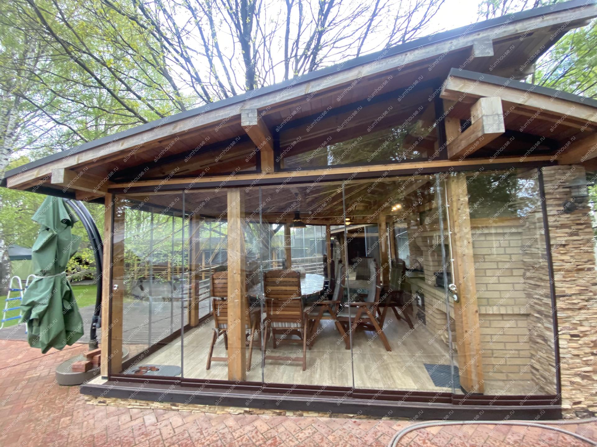 Раздвижные стеклянные стены для беседки обеспечивают панорамный вид и защиту от погоды, а створки плавно сдвигаются по направляющим, экономя место и открывая проём на большую ширину.