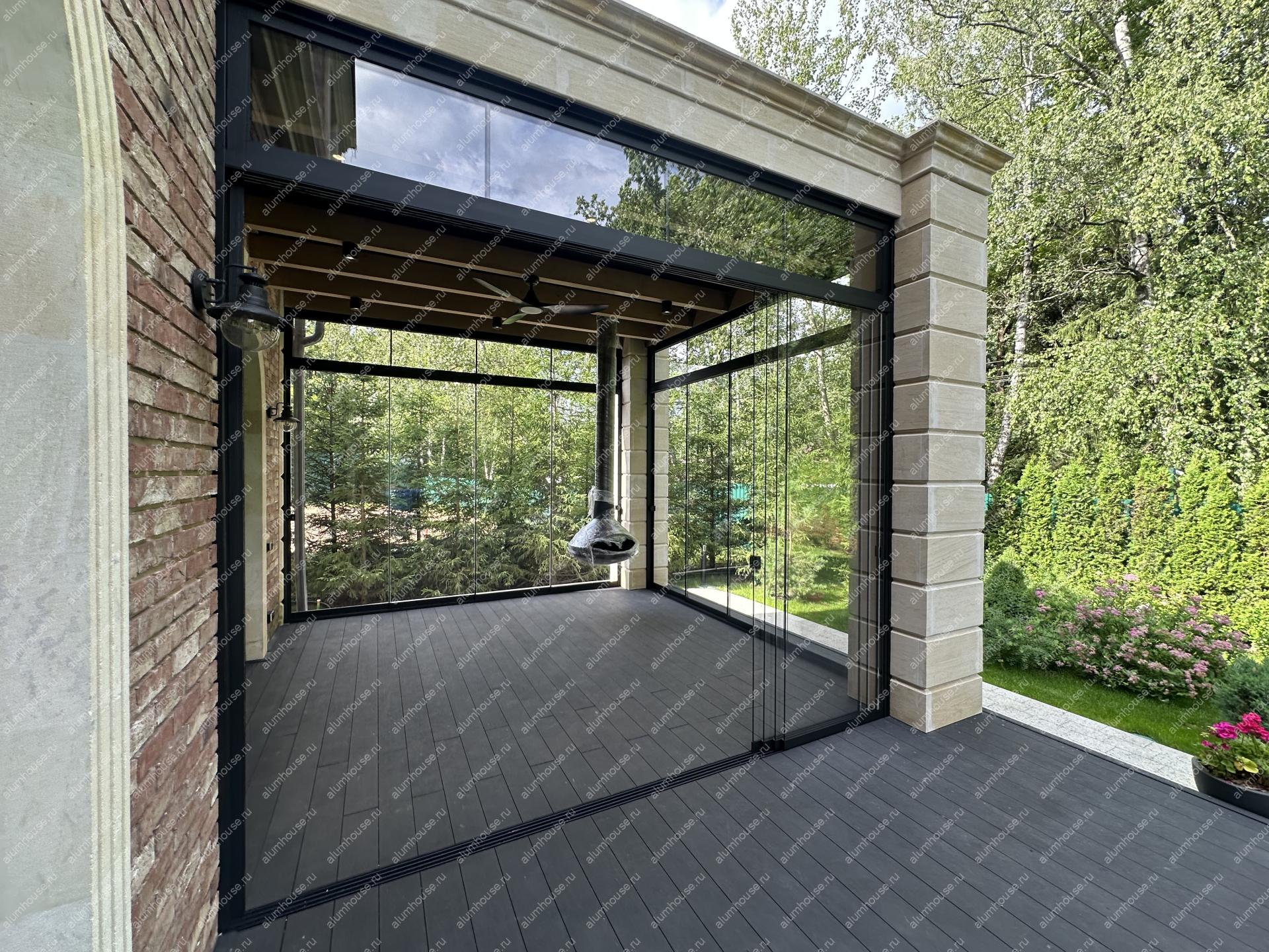 Лёгкое безрамное остекление превратило летнюю кухню в светлое трансформируемое пространство с панорамным видом и защитой от ветра и осадков.