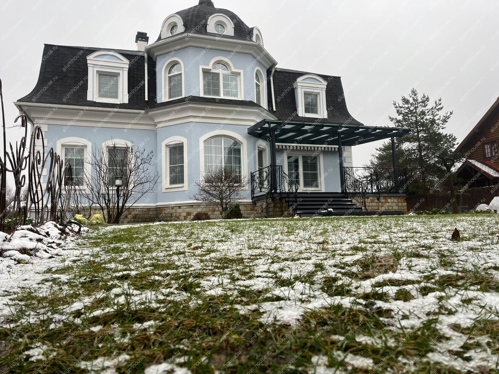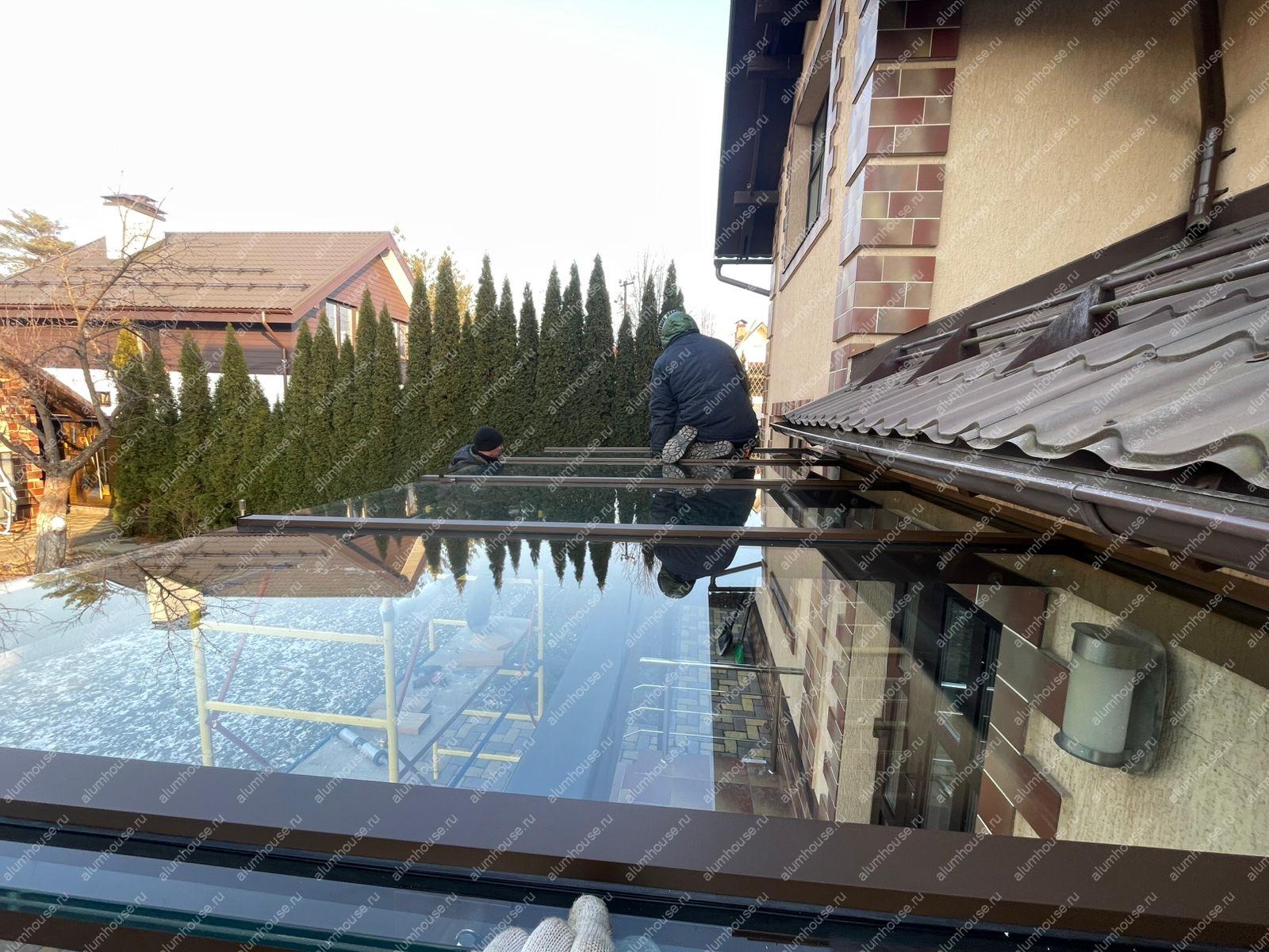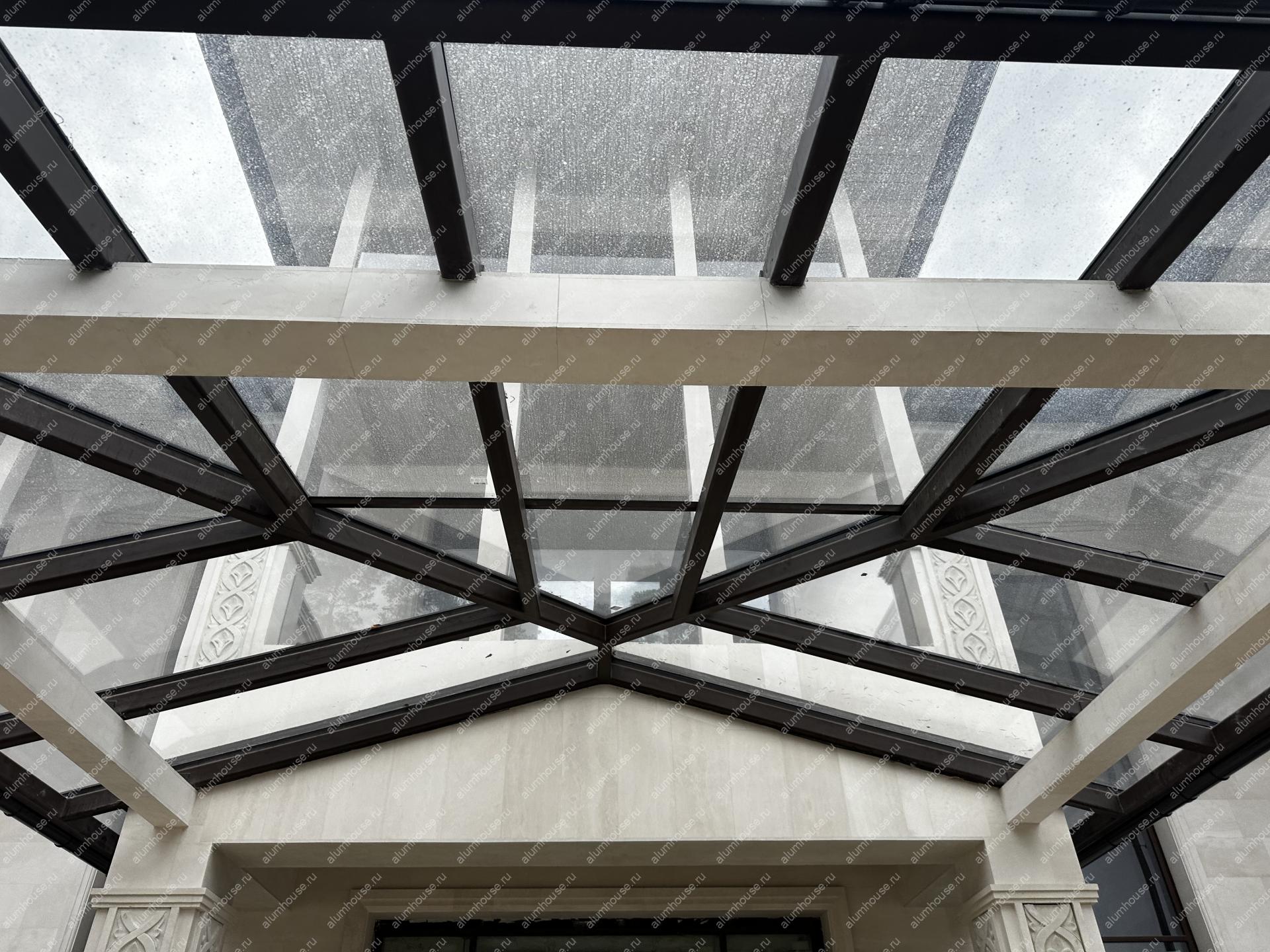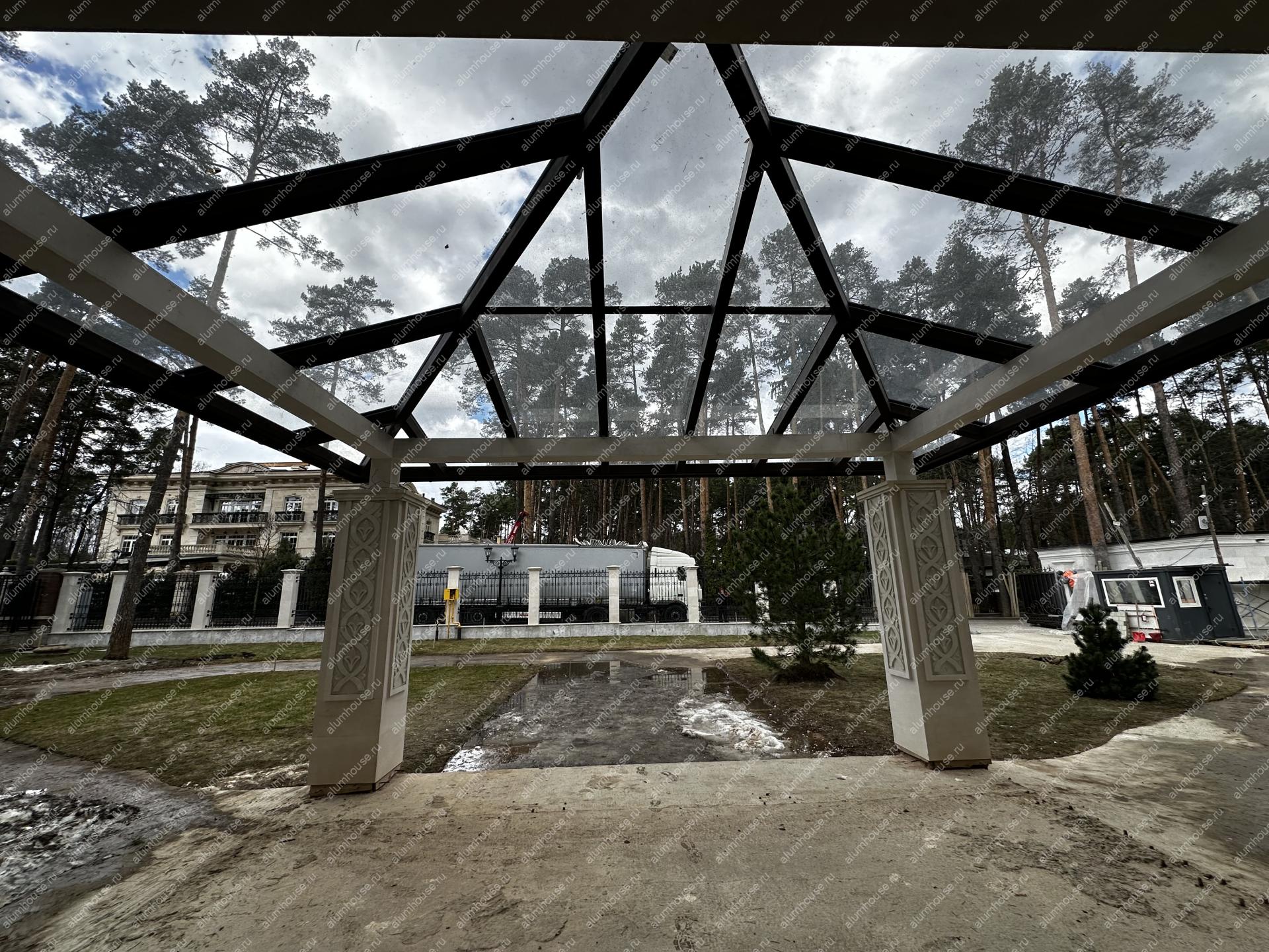 Выполнено строительство трёхскатного металлического навеса со стеклом в загородном доме.